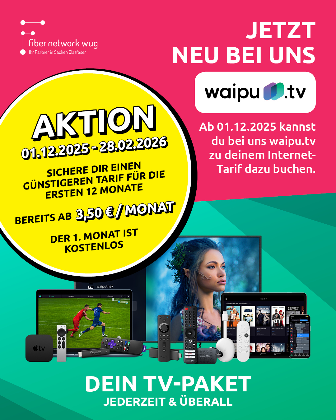 waipu.tv ist ab sofort für alle unsere Kunden verfügbar. Weitere Informationen finden Sie unter https://www.fiber-network.de/tv